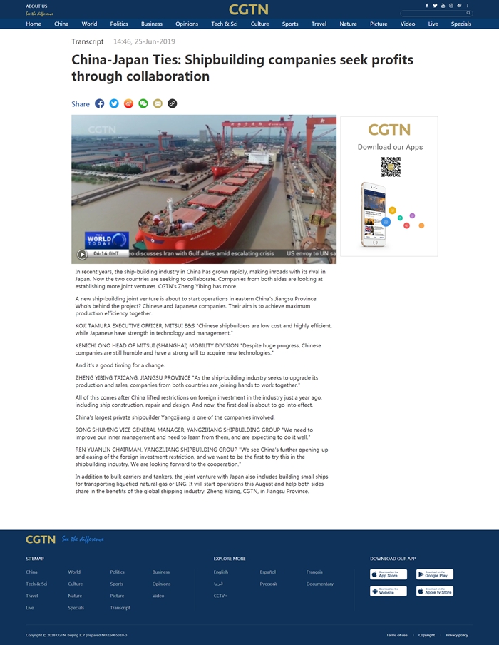 二十國集團(G20)領導人峰會將于本月28日至29日在日本大阪舉行,峰會發(fā)布八大主題,經貿仍唱主角。當前全球經濟增長乏力,根據世界貿易組織、聯(lián)合國等多邊組織發(fā)布的相關報告,全球經濟在貿易、投資等方面都缺乏動力。在此背景下,CGTN(中國國際電視臺)記者鄭亦冰走進揚子江船業(yè),探尋中日造船企業(yè)通過合作造船,實現(xiàn)共贏的相關進展。